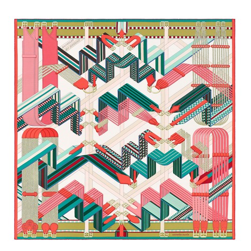Among the many books preserved in the Émile Hermès collection are the albums of Camille et fils, a Parisian saddler based in the 10th arrondissement. A plate dating from 1895 illustrating a selection of girths caught the attention of Virginie Jamin, who was attracted by the restrained beauty of the drawing. The designer, a specialist in geometric compositions, gave free rein to her imagination, deploying the girth motif in a playful zigzag pattern. In an elegant and fascinating dance, the girths mirror each other as they criss‑cross or zigzag in a harmonious mix of lines, checks and coloured weaves.